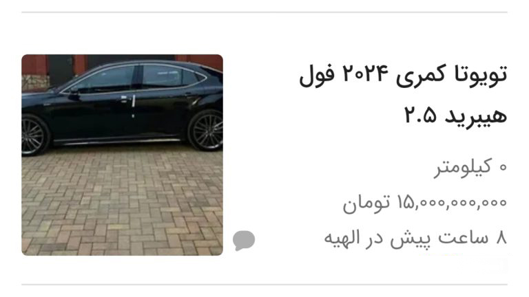 در بخش دیگری از این گزارش، یکی از آگهیهای منتشر شده برای تویوتا کمری ۲۰۲۴ وارداتی با پیشرانه هیبرید ۲.۵ لیتری، قیمت ۱۵ میلیارد تومان برای فروش این خودرو اعلام کرده است. در این آگهی ذکر شده که خودرو تا قبل از عید از گمرک ترخیص خواهد شد.